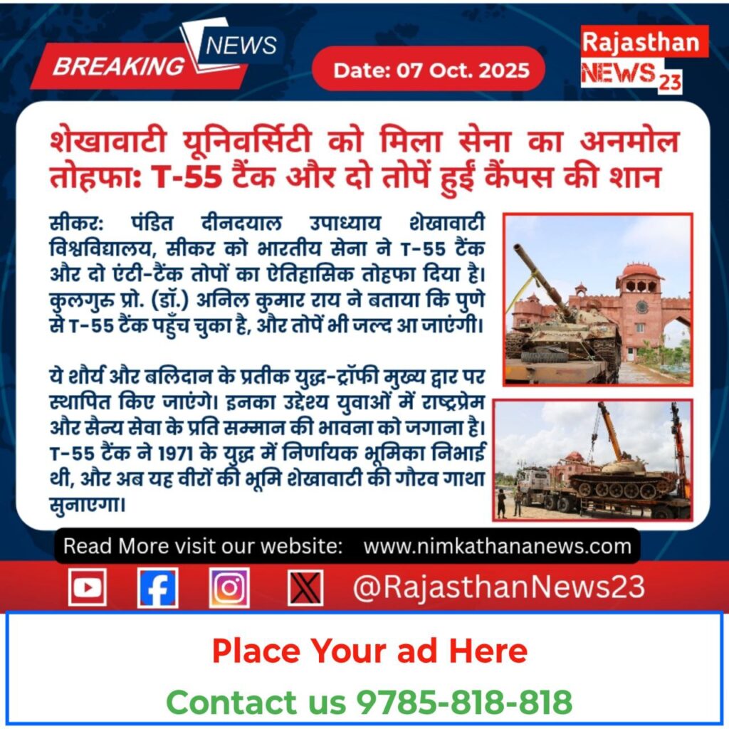 सीकर/जयपुर। पंडित दीनदयाल उपाध्याय शेखावाटी विश्वविद्यालय, सीकर को भारतीय सेना ने पराक्रम और शौर्य के प्रतीक के रूप में ऐतिहासिक टैंक टी-55 और दो तोपों का अनमोल तोहफा दिया है। ये ‘युद्ध-ट्रॉफी’ अब विश्वविद्यालय परिसर में विद्यार्थियों और युवाओं को भारतीय सेना के अदम्य साहस, देशभक्ति और गौरवपूर्ण इतिहास से रूबरू कराएंगी।शेखावाटी विश्वविद्यालय के कुलगुरु प्रो. (डॉ.) अनिल कुमार राय ने बताया कि यह ऐतिहासिक टैंक और तोपें केवल सेना के हथियार नहीं, बल्कि शौर्य, बलिदान और पराक्रम के जीवंत प्रतीक हैं। जिससे युवाओं और विद्यार्थियों के मन में सेना के प्रति सम्मान, राष्ट्रप्रेम व देश भक्ति की भावना जाग्रत होगी। प्रो. राय ने बताया कि यह टैंक मंगलवार को किरकी, पुणे से शेखावाटी विश्वविद्यालय पहुंच गया और दोनों तोपें भी जबलपुर से जल्द ही यहां पहुंच जाएंगी। ये युद्ध-स्मृति चिन्ह विश्वविद्यालय के मुख्य द्वार पर स्थित ‘शौर्य दीवार’ के पास स्थापित किए जाएंगे।